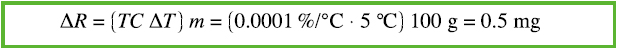 如果您在XP/XS分析天平上對100g的加載值(樣品質(zhì)量)進(jìn)行稱量,并且實(shí)驗(yàn)室的環(huán)境溫度自上一次校準(zhǔn)之后變化5?C,則在最差的情況下可得出以下最大結(jié)果變化值ΔR(XP的溫度系數(shù)為0.0001%/ ?C):