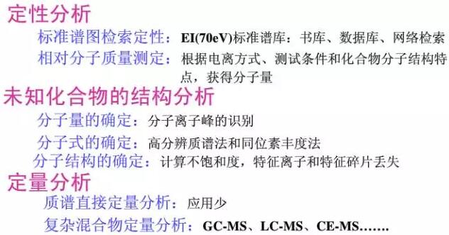 質譜法特點是唯一可以確定分子量的方法,特別是現(xiàn)代生物質譜,適用于生物大分子分子量(數(shù)十萬)定;具有極高靈敏度,檢測限達10-14g。