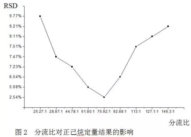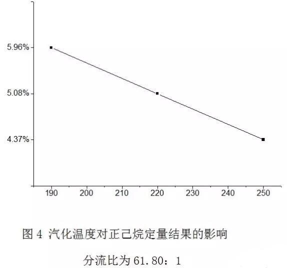 為考察分流比和汽化室溫度對實(shí)驗(yàn)結(jié)果的影響,調(diào)節(jié)分流比,分別為25.27:1 、28.87:1、44.78:1、61.8:1、76.92:1、92.88:1、113:1、127.1:1、146.3:1,實(shí)驗(yàn)結(jié)果見圖2和圖3。在分流比為61.8:1時(shí),考察汽化溫度對測定結(jié)果的影響,見圖4。