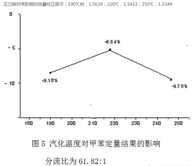 ②進(jìn)樣溫度的變化對分析結(jié)果也有影響。分流比在1/30-1/80范圍內(nèi),如61.80:1時(shí),隨著進(jìn)樣口溫度的升高(190-250℃),低沸點(diǎn)組分正己烷正誤差減小,較高沸點(diǎn)組分甲苯的負(fù)誤差減小后增加。所以,本實(shí)驗(yàn)選擇的汽化溫度為220℃。