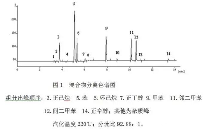 以苯作內(nèi)標(biāo)物,用氣相色譜法測定混合物中正己烷和甲苯的含量。色譜條件:毛細(xì)管柱SE-30(30m ×0.25mm×0.32μm);柱溫,40℃保持5分鐘,15℃每分鐘升到170℃,保持1分鐘;氫火焰離子化檢測器(FID)溫度260℃;分流進(jìn)樣量為0.4μL。色譜圖見圖1。