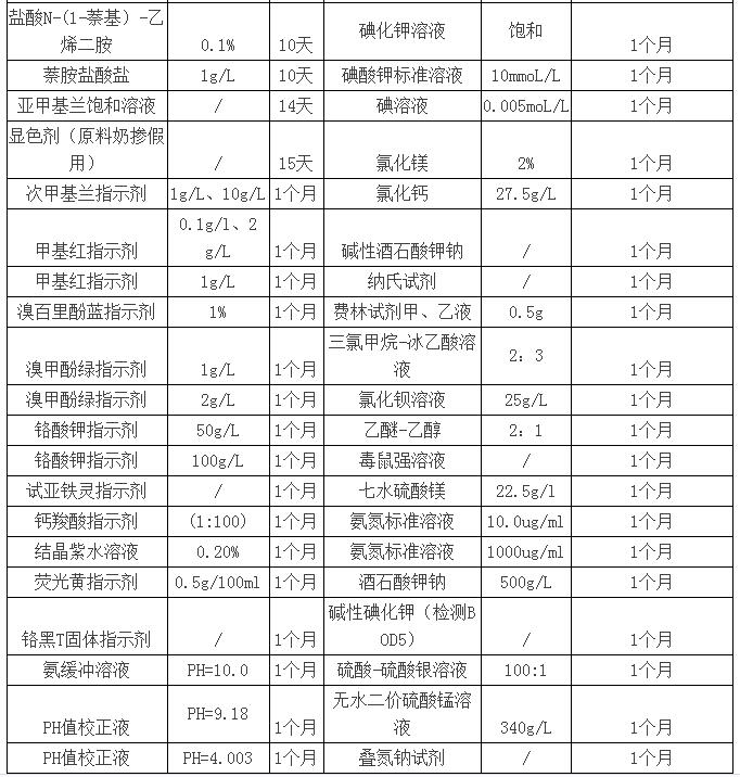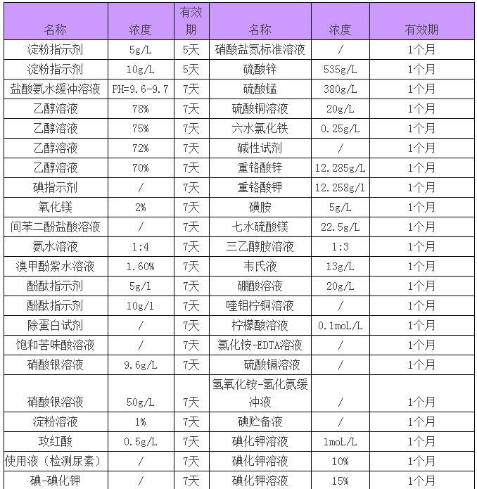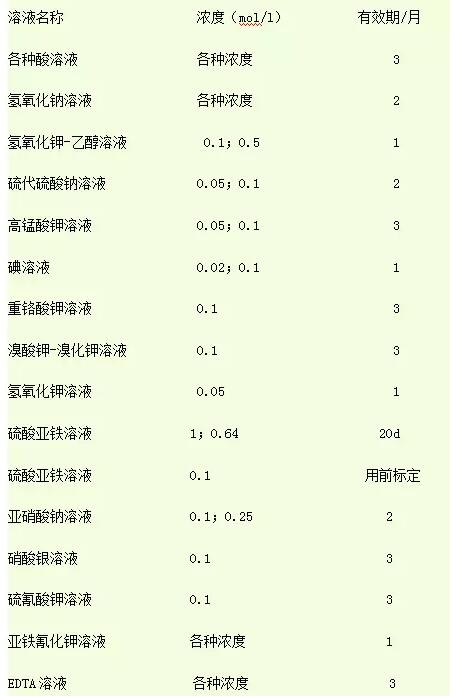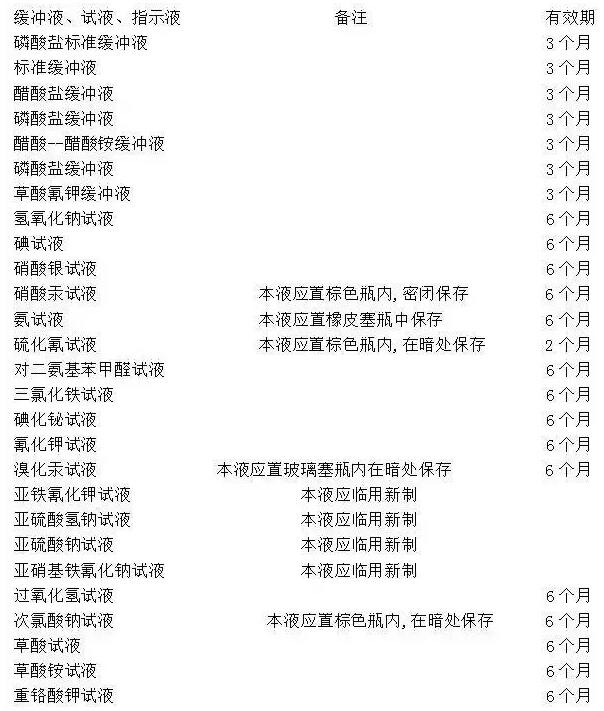 相比標(biāo)準(zhǔn)溶液的有效期,各種緩沖液、試液、指示液也有其有效期限制,多數(shù)實(shí)驗(yàn)室都是根據(jù)前輩的經(jīng)驗(yàn)來規(guī)定期限,也有的實(shí)驗(yàn)室為了防止過期現(xiàn)象導(dǎo)致的樣品分析結(jié)果誤差的產(chǎn)生,盡量都是現(xiàn)配先用,或者最多使用一個(gè)月。對于某些較穩(wěn)定的溶液來說,不必矯枉過正,一方面會(huì)造成浪費(fèi),一方面也增加了分析人員的工作量,那么,到底如何規(guī)定各種緩沖液、試液、指示液的使用期限呢,請參考下表!