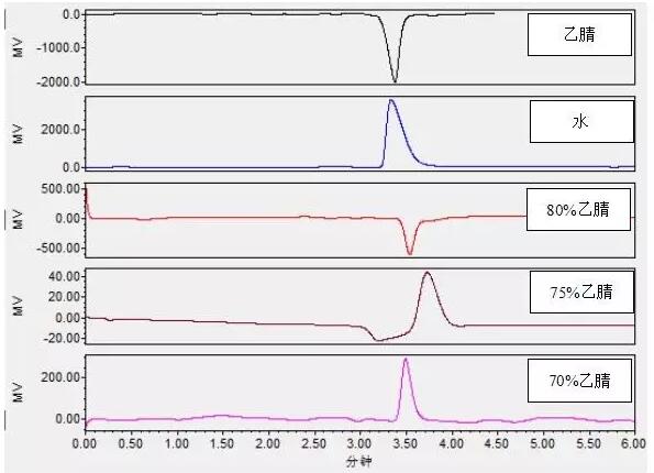 為了減少分析時(shí)間,同時(shí)減少標(biāo)準(zhǔn)品的消耗(麥芽糖的標(biāo)準(zhǔn)品只有0.25g/瓶)決定直接用流動(dòng)相中的兩相(乙腈和水)進(jìn)行嘗試。通過(guò)改變乙腈和水的體積比考察溶劑峰的出峰情況。