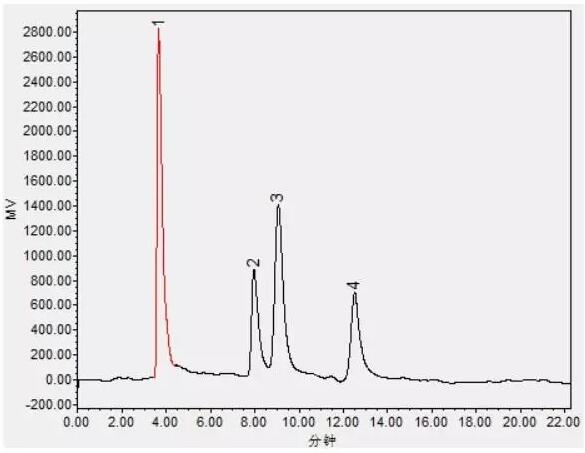 從圖中可以看出,雖然4種糖的混合標(biāo)準(zhǔn)溶液色譜圖中對(duì)應(yīng)出現(xiàn)4個(gè)色譜峰,但是卻存在以下幾個(gè)問(wèn)題: