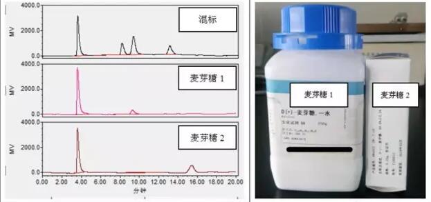 難道是色譜柱的原因?色譜柱柱效下降導(dǎo)致兩者不能分離?于是更換新的色譜柱再次分離,結(jié)果還是沒(méi)有能夠?qū)烧叻蛛x。如果葡萄糖和麥芽糖無(wú)法分離,實(shí)驗(yàn)便無(wú)法進(jìn)行下去,在經(jīng)過(guò)上述嘗試之后將問(wèn)題的矛頭指向了所用的試劑。查試劑臺(tái)賬,發(fā)現(xiàn)實(shí)驗(yàn)室里還有其他品牌分析純的葡萄糖,而麥芽糖僅此一瓶,但是幸運(yùn)的是發(fā)現(xiàn)了葡萄糖和麥芽糖的標(biāo)準(zhǔn)品,決定使用麥芽糖和葡萄糖的標(biāo)準(zhǔn)品試一下。