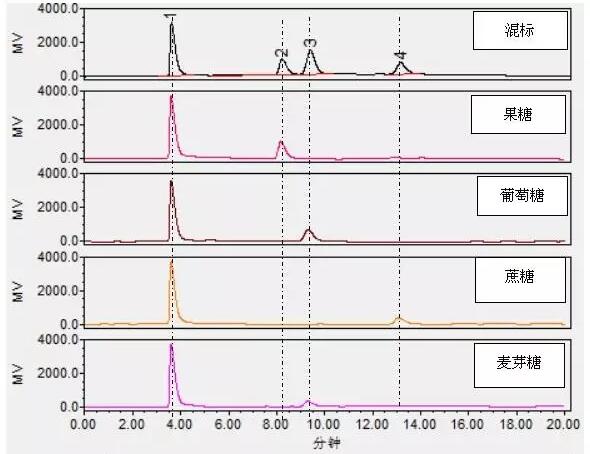 上述測(cè)試過(guò)程中使用的是4種糖的混合標(biāo)準(zhǔn)溶液,每個(gè)峰對(duì)應(yīng)的待測(cè)組分還是未知的,因此在該儀器分析條件下先對(duì)各組分進(jìn)行單標(biāo)確認(rèn)。