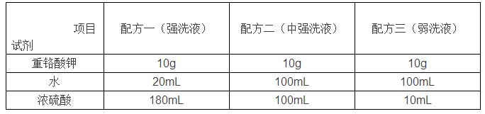 重鉻酸鉀(K2Cr2O7)在酸性溶液中,有很強(qiáng)的氧化能力,對玻璃儀器又極少有侵蝕作用。所以這種洗液在實驗室內(nèi)使用最廣泛。配制濃度各有不同,從5~12%的各種濃度都有。配方見下表,本實驗室采用配方一(強(qiáng)洗液)。