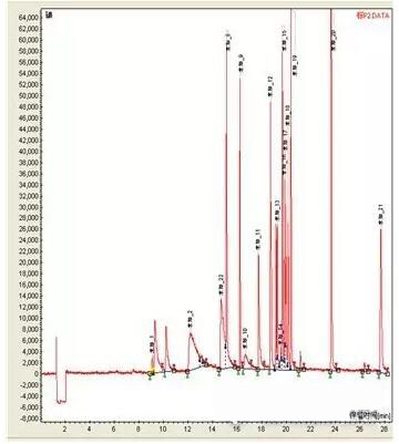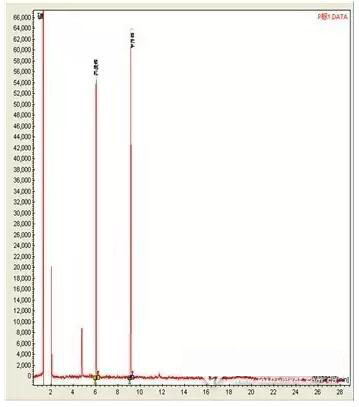 我們對上面的程序升溫條件進行了優(yōu)化,柱溫由100℃降到80℃,程序升溫:80℃保持1min,8℃/min升到250℃,保持6.0min,共28.25min.